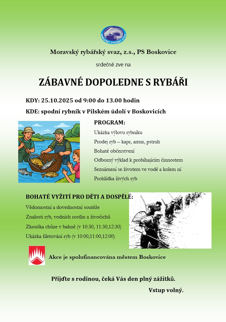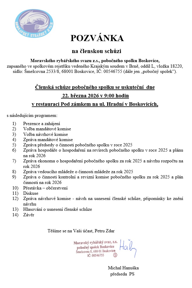 27. 2. 2026 se uskuteční ve 20.00 hod. XXVI. Rybářský ples - Sokolovna Boskovice. Předprodej vstupenek od 22. 1. 2026 v prodejně rybářských potřeb NA HÁČKU (ul. Sokolská 38, tel.: 732 981 395).