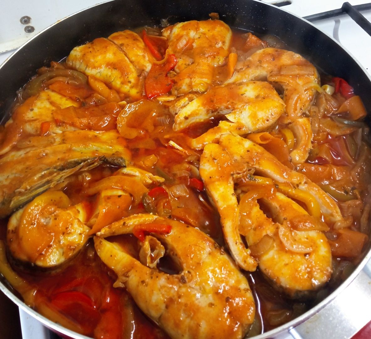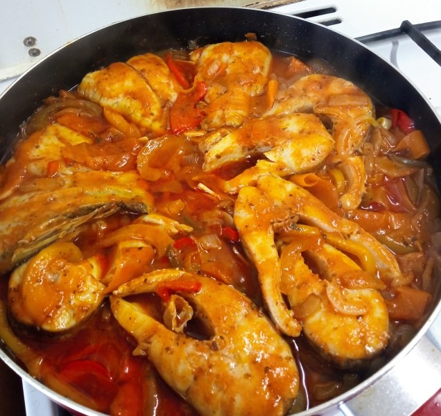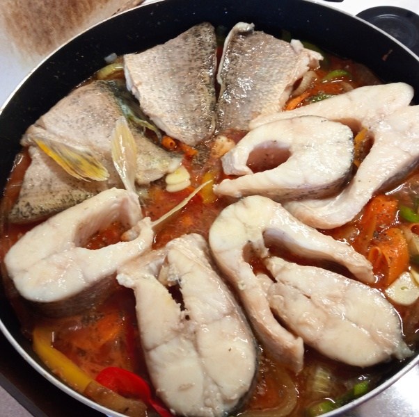 Jakmile zesklovatí, přidáme rajčata, hořčici, pepř, vložíme zpět porce ryby a za podlévání bílým vínem dusíme pod pokličkou. Porce v základu obracíme a poléváme vydušenou šťávou.