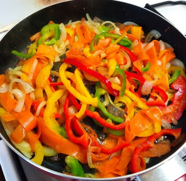 Na tuk dáme na nudličky nakrájenou slaninu, cibuli na půlkolečka, škrabkou na brambory naškrábané pásky mrkve, na proužky nakrájenou papriku a česnek na kolečka. Jemně osolíme a restujeme.