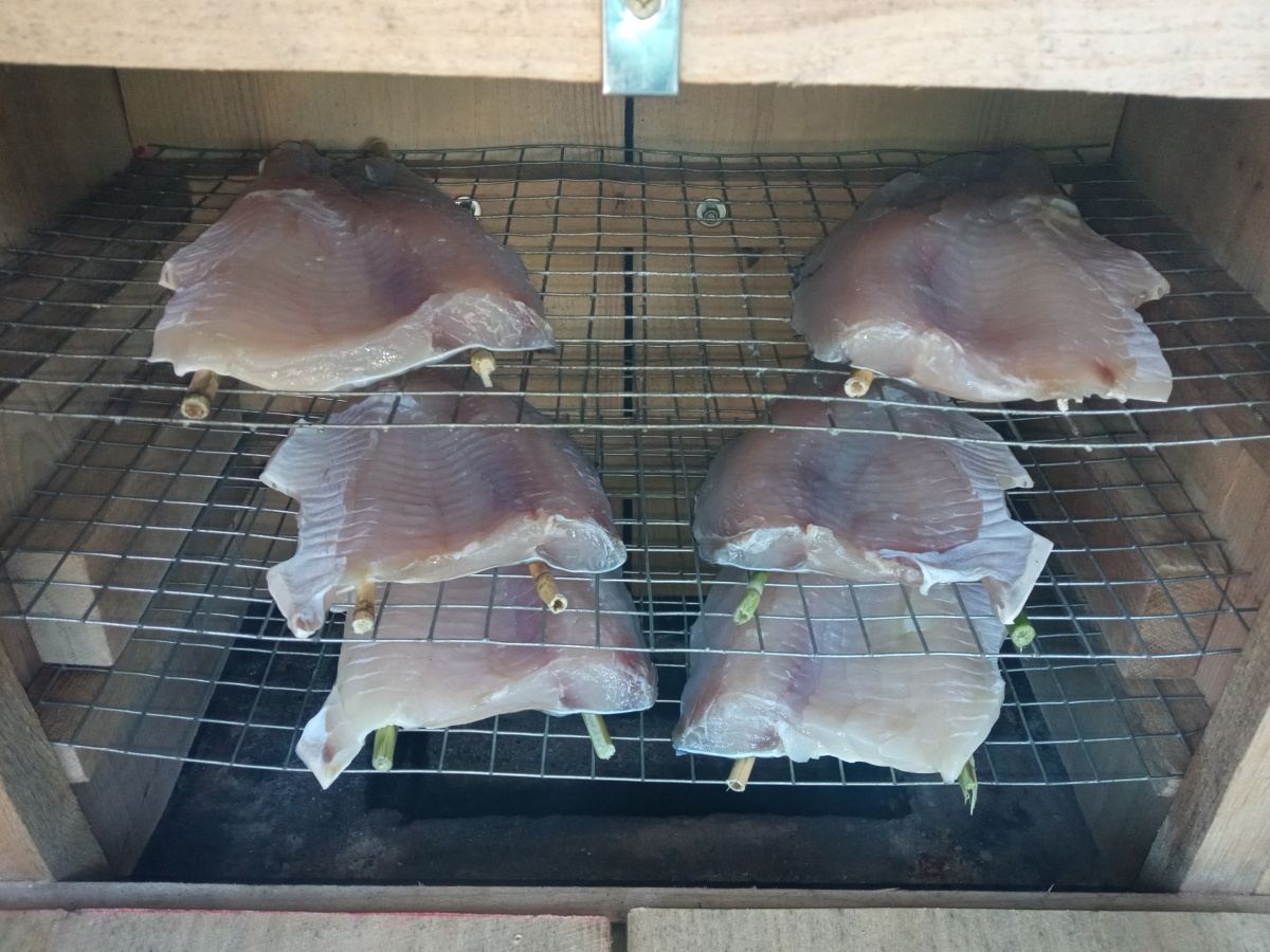 Podkovy z větších ryb (tolstolobik, kapr, sumec) napíchneme na háčky, pstruhy a makrely buď vážu za hlavu na provázek, nebo nabodávám na speciální věšáček s háčkem, který má bodce přes dutinu břišní do hřbetu okolo páteře a zajistí i otevření břišní dutiny. Filety pokládám na síta v jednotlivých patrech udírny.